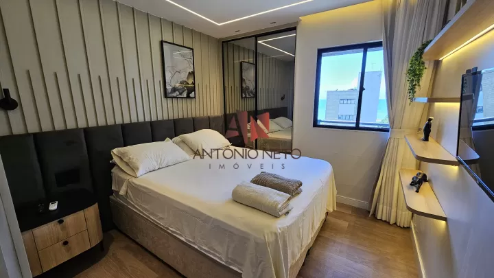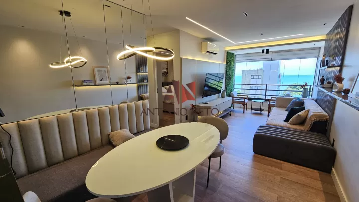A sala de estar conta com um sofá sofisticado, painel com televisão e rack, 1 aparelho de ar condicionado e uma integração da varanda, além de uma linda vista do mar da Beira Mar de Fortaleza.