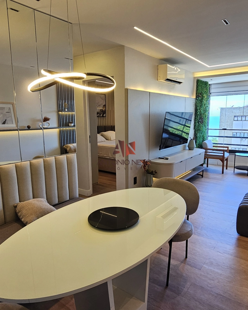 O apartamento inteiro conta com um projeto luminotécinico e móveis projetados para otimizar todo o espaço.