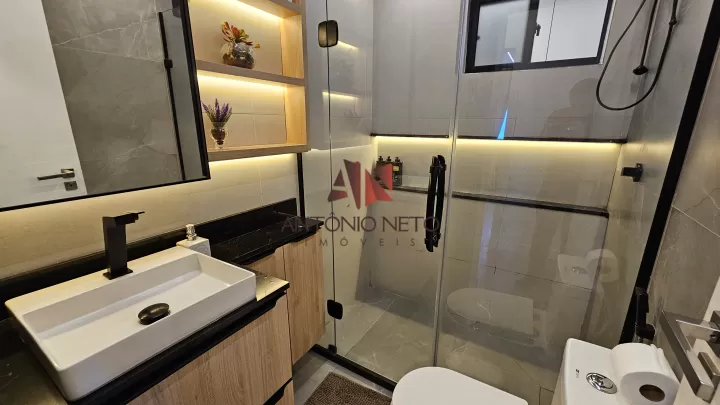 O banheiro é pura sofisticação, com porta de video temperada no box, armário projetado, bancada de pedra e cuba branca, chuveiro elétrico.