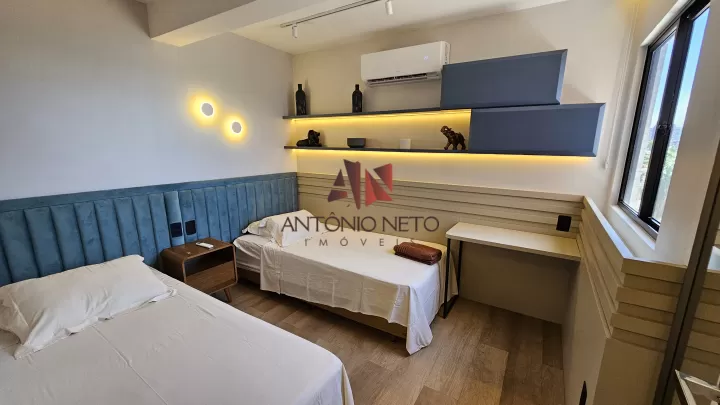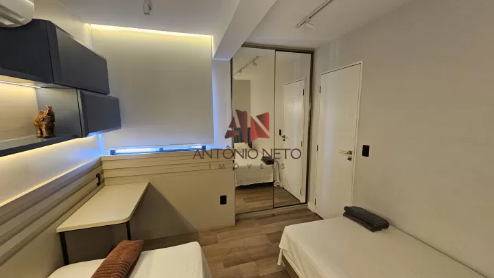 O segundo quarto possui 2 camas de solteiro, luzes em trilhos, nichos e também um guarda roupas projetado e mais um ar condicionado, contabilizando 3 maquinas de ar condicionados pelo apartamento.
