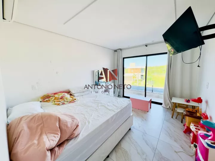 A casa dispõe de 4 quartos, sendo 3 suítes no pavimento superior, incluindo uma elegante suíte master com closet e varandas privativas que proporcionam ventilação e conforto. No pavimento térreo, há um quarto versátil, ideal para hóspedes ou escritório.