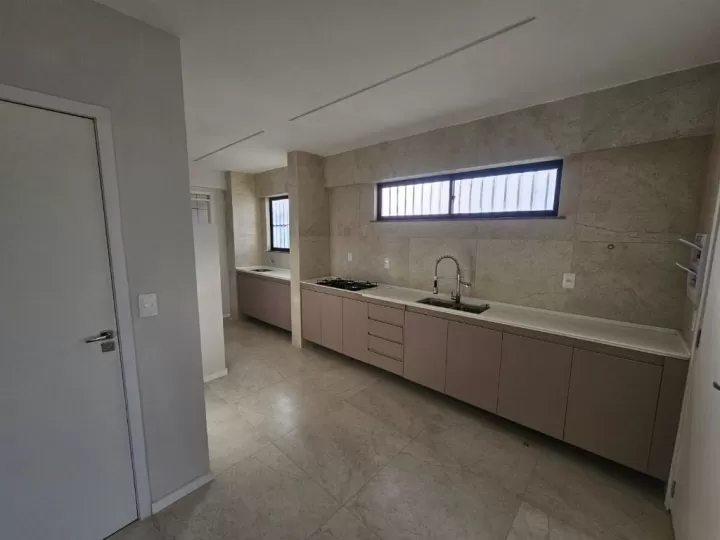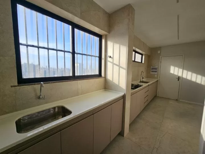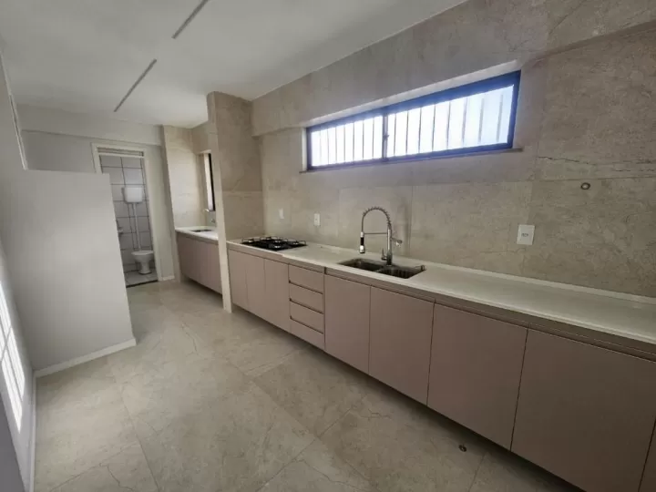 A cozinha é ampla e extremamente funcional, equipada com cooktop, torneira gourmet, bancadas em mármore novos e modernos, além de despensa espaçosa e área técnica.
