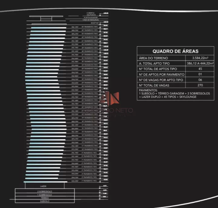 Apartamentos Por Andar: 01 Torres: 01 Pavimentos: 50 sendo 03 (Subsolos) + 01 (Térreo) + 01 (Lazer) + 45 (Tipo) Elevadores: 04 sendo 03 (Sociais) e 01 (Serviço)